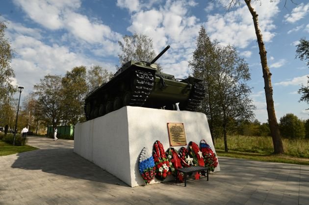 Танк «Клим Ворошилов» или КВ-1 увековечивает подвиг экипажа старшего лейтенанта Зиновия Колобанова в поселке Новый Учхоз.